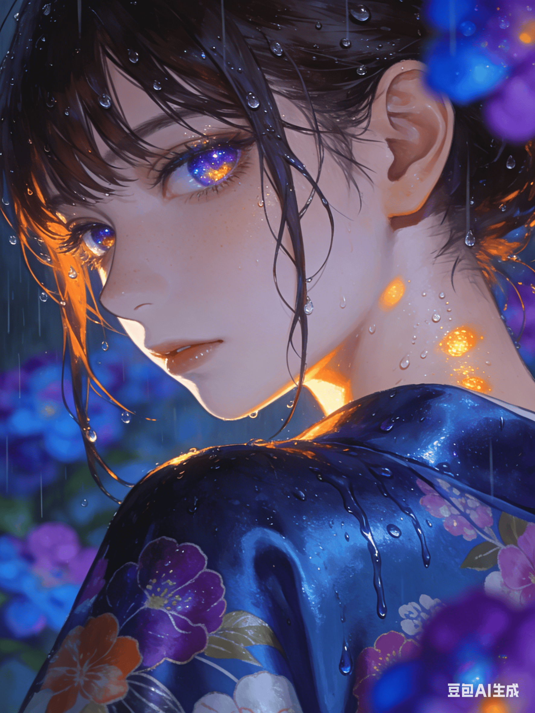 服装: 穿着深蓝色、带有光泽感丝绸面料的和风服饰,上有生动的大面积花卉图案。【重点修改】 只有衣服的布料表面,有数股细小的水流顺着纹理褶皱成股流下,而头发与皮肤上仅有点状水珠。