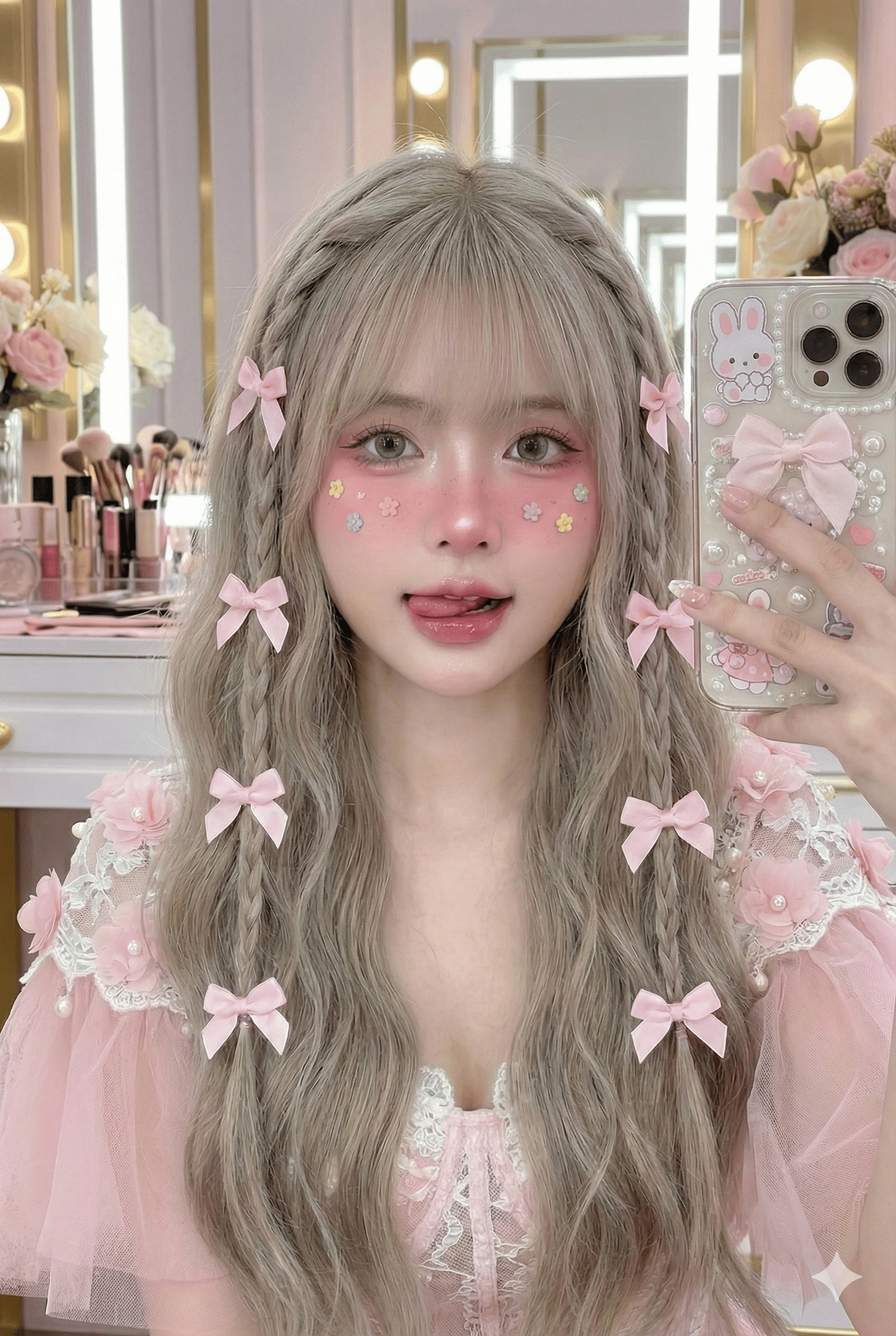 "装饰": "脸颊上贴有微小的柔和色花朵贴纸",
