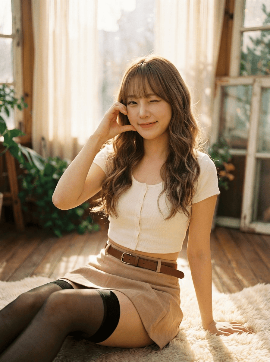 "姿势": "优雅地坐在柔软的奶油色地毯上,双腿并拢收起,形成纤细的剪影",