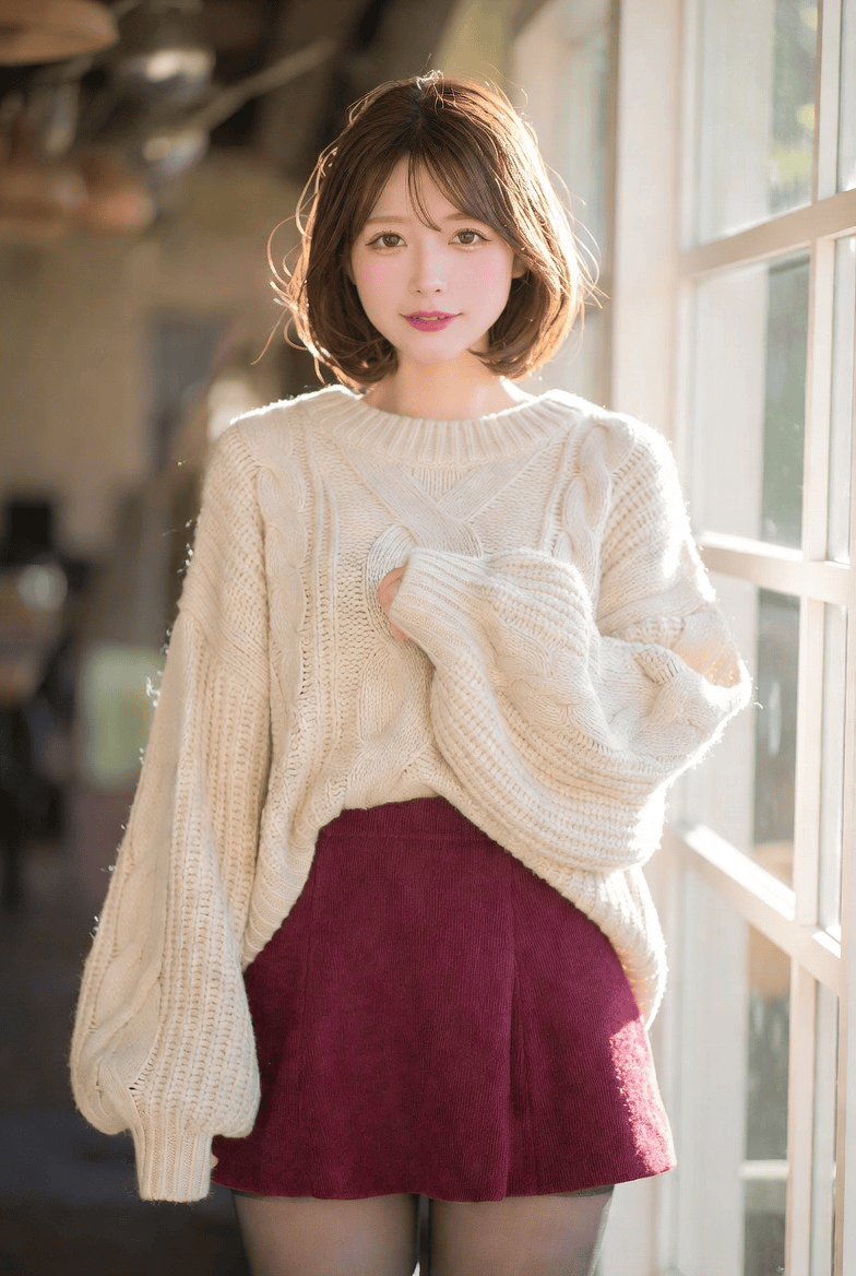 "外貌": "迷人的年轻女性,面容青春纯真,肌肤柔软如瓷器,齐肩栗棕色波波头,带有空气感的'透明'刘海修饰脸庞",